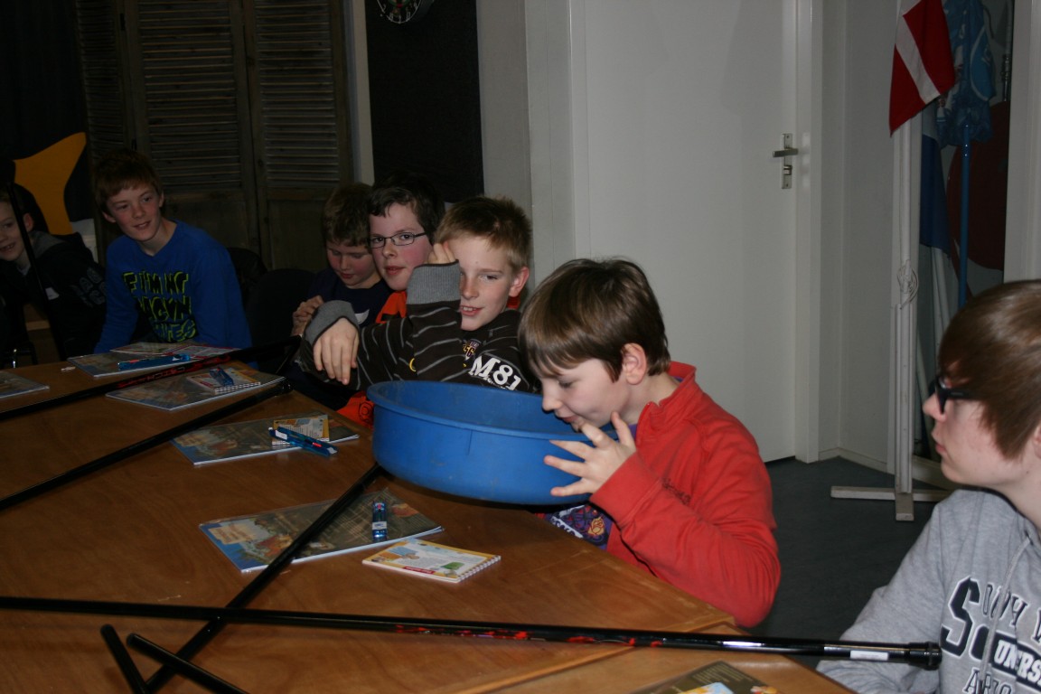 Het is dan ook muisstil als bovenmeester Jan van de Bovenkamp het woord neemt en in het kort het programma van deze avond uiteenzet. Aan de hand van een werkboek en het boekje “Leer vissen met de vaste hengel” werd duidelijk welke spullen je nodig hebt om een vistuigje te maken, hoe je een hengel optuigt, welke aassoorten je nodig hebt, hoe je een goed lokvoertje maakt en niet onbelangrijk hoe je een vis onthaakt.